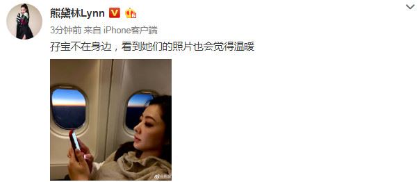 为此,近日在外忙工作不能陪伴在女儿身旁的熊黛林也有些不适应,5月17日,熊黛林便发博晒出一张飞机上的照片并附文:“孖宝不在身边,看到她们的照片也会觉得温暖”。