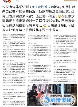任素汐的前任老公李洋也针对此事做了回应,据他所言,两人是大学同学,14年领的证,16年4月任素汐毫无征兆的提出离婚,这刺激导致他一只耳朵失聪,到现在都还没恢复,离婚后才知道,前妻任素汐出轨发生在2015年,这件事身边很多人都晓得,但只有他一人被蒙在鼓里,这也成为他一直迈不过去的坎。