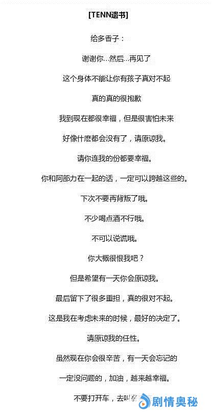 虽然无法忍受妻子的背叛,但遗书中却丝毫没有责怪妻子的意思,反而处处为她着想,希望她能永远幸福,最后还担心妻子看到自己自杀的可怖情景,所以提醒到:“不要打开车子,直接叫警察。”