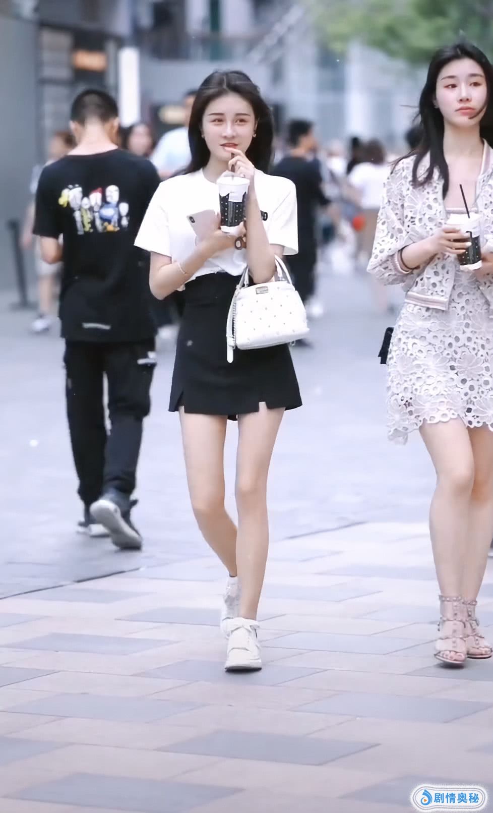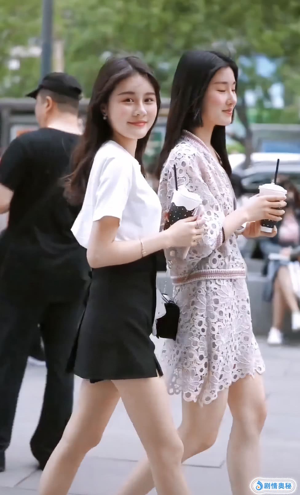 双胞胎逛街,左边的这个看上去像姐姐的感觉,她打扮比较成熟,她穿的一套都是这种比较有女人味的衣服,穿起来特别好看,她的裙子是比较短的款式,看上去也太美了!
