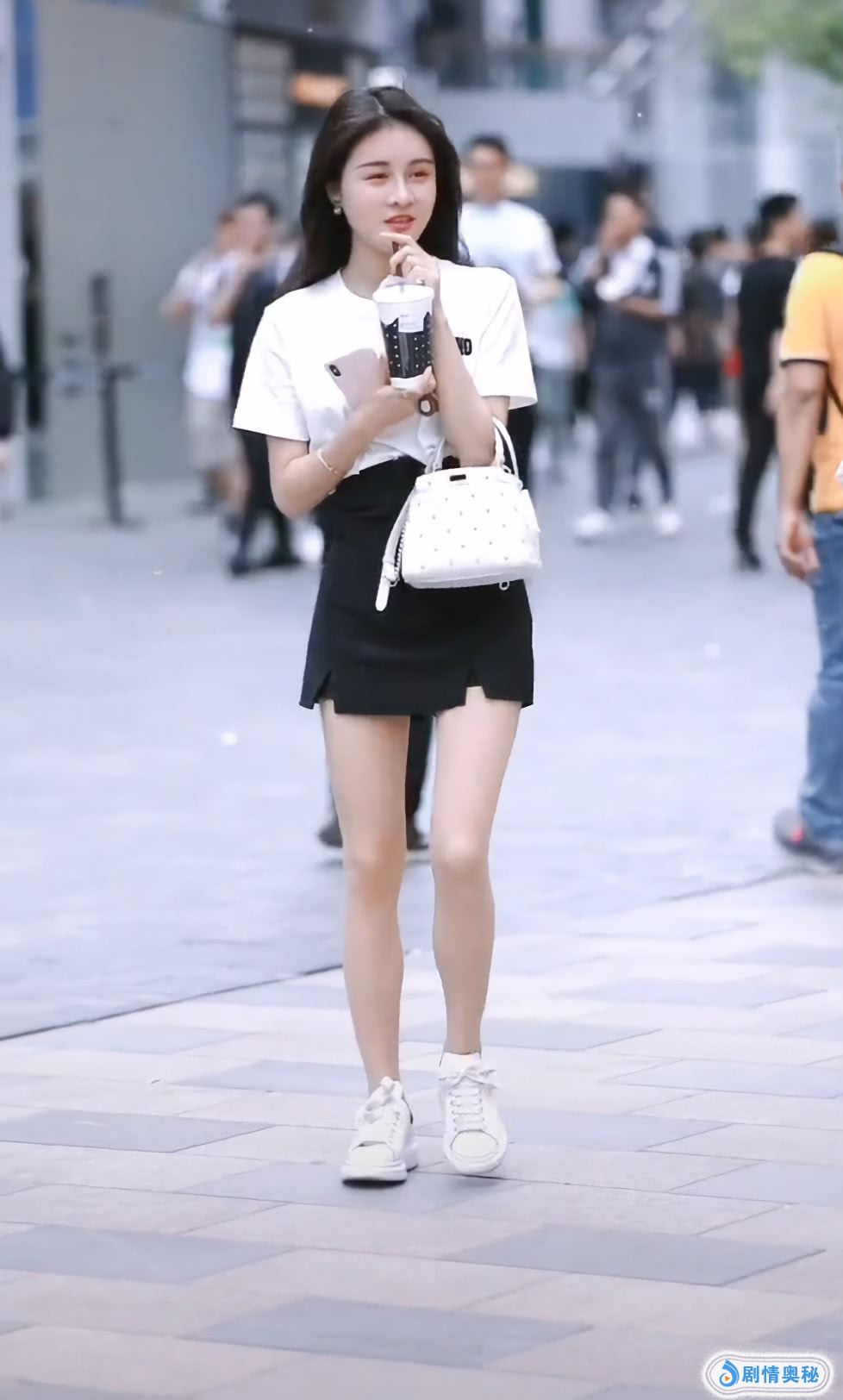 同样高却更显腿长,主要还是因为她穿的衣服比较适合,而她穿的裙子是黑色的,把上衣束进裙子里面,因此显得她的腿更长了,她的气质还不错,搭配一双白色运动鞋,非常大方!