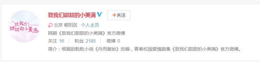 目前《致我们甜甜的小美满》这部剧也已经有了官方微博,这个官方微博所关注的两位重要的人物,便是原小说的作者,还有一位就是《致我们单纯的小美好》《致我们暖暖的小时光》的导演。
