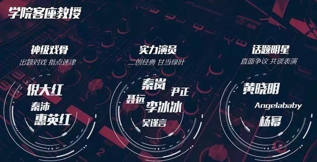 于正 不愧是是会炒作,既做了一档综艺,还把下一部的男女主炒红了。这档节目的内容吸引人之外,嘉宾导师的阵容更是话题颇多。张颂文和郝蕾为学院常驻导师,倪大红、惠英红、秦沛、李冰冰、黄晓明、聂远、秦岚、吴谨言、杨幂、尹正、angelababy等人将作为每期的客座教授,帮助学员们提高演技。