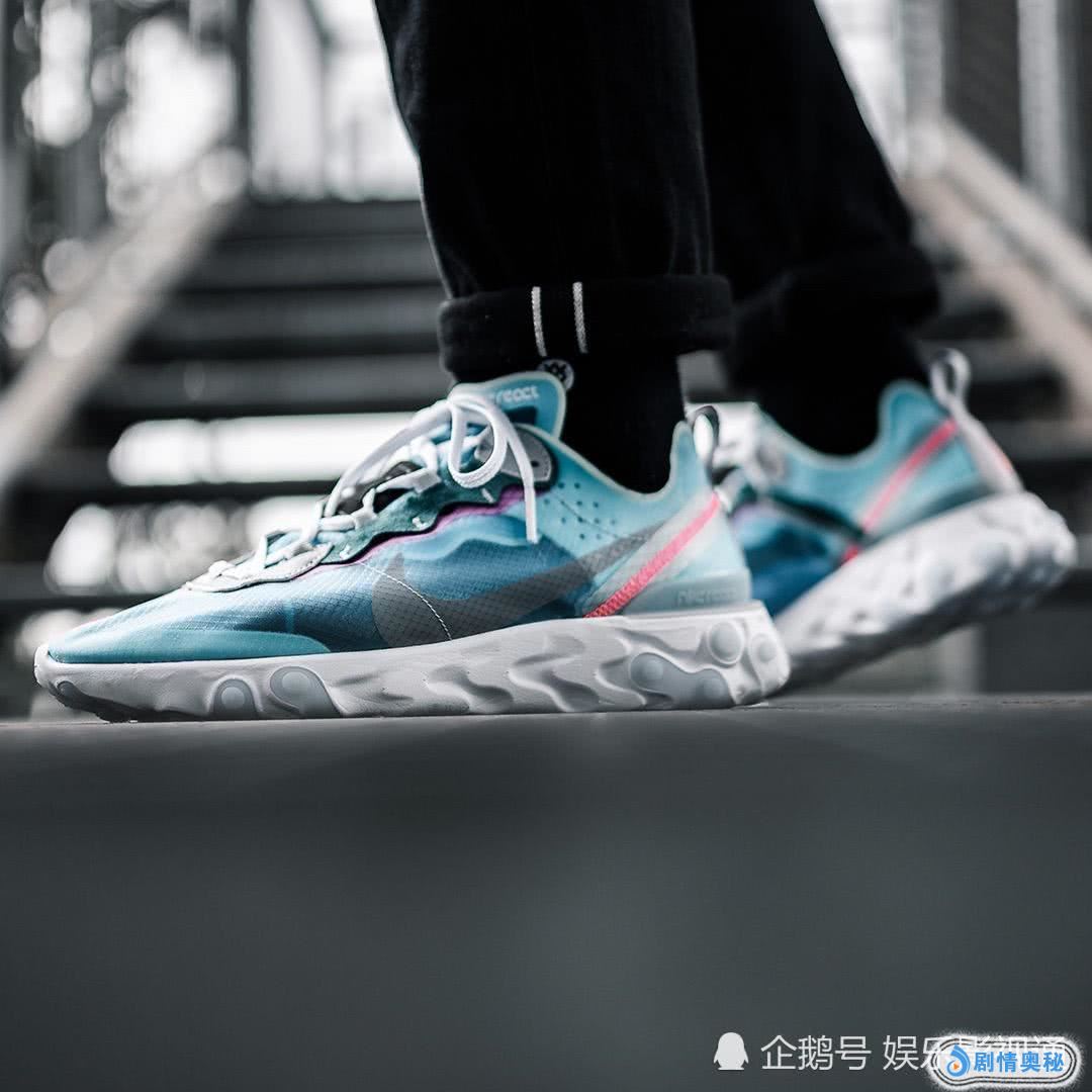 第三款是还有这款胡冰蓝,这款首先颜值必须的夸一下了,整体的配色很丰富,底色是蓝色,很清爽的感觉,夏天穿很适合,缓震科技是采用了react缓震材质加持,所以缓震效果上脚跟踩屎了一样!