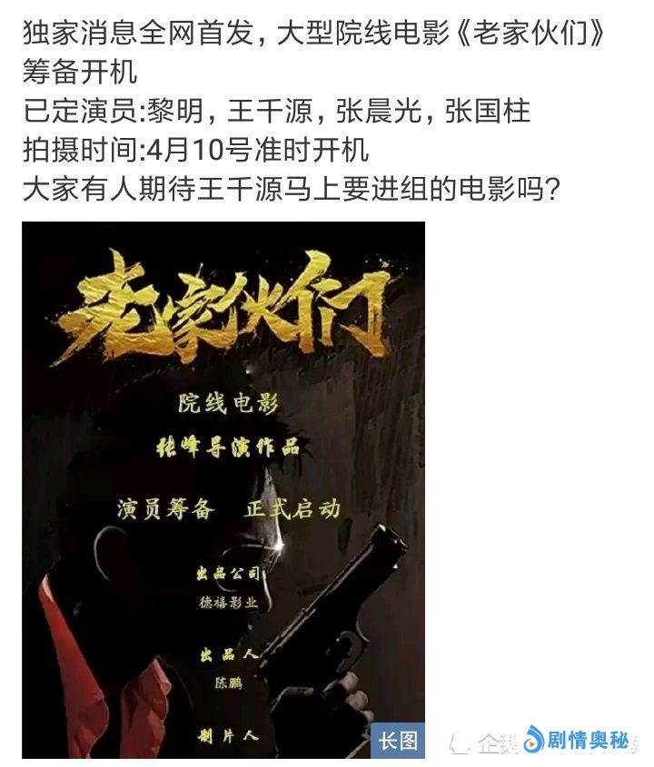 - 院线电影《老家伙们》下月开拍,已定演员黎明王千源等主演