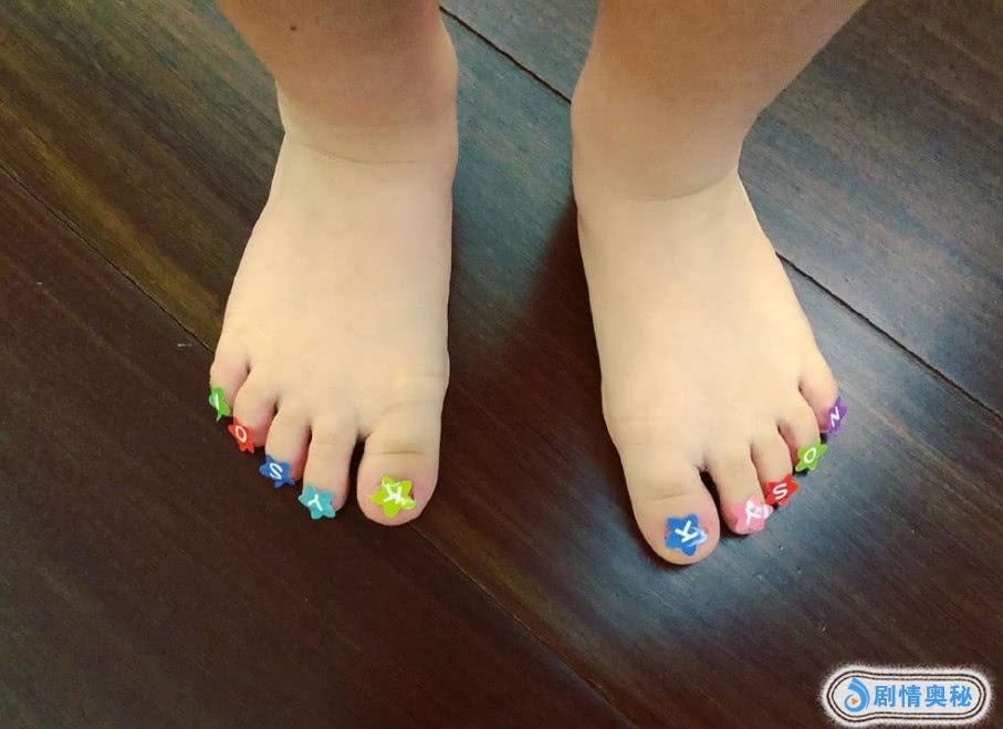 - 林志颖双胞胎儿子近照,凯凯脚趾上贴满五颜六色字母贴纸,超萌!