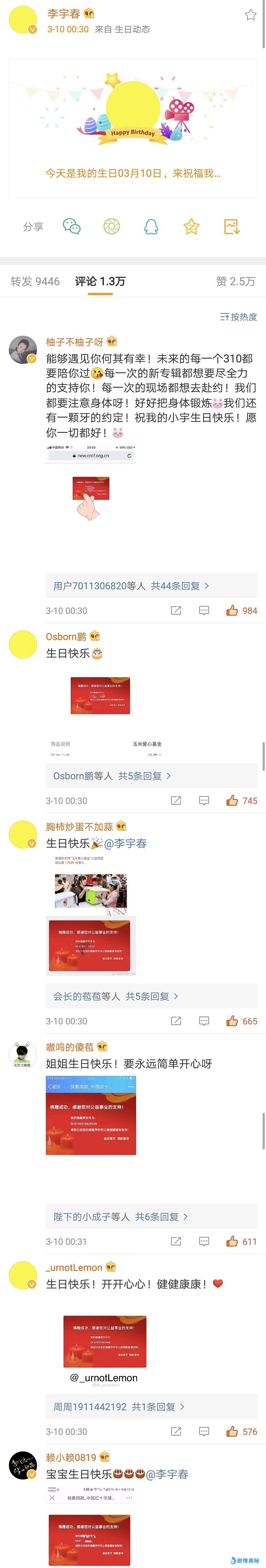 - 李宇春过生日微博评论太暖心,网友:这才是真正的偶像
