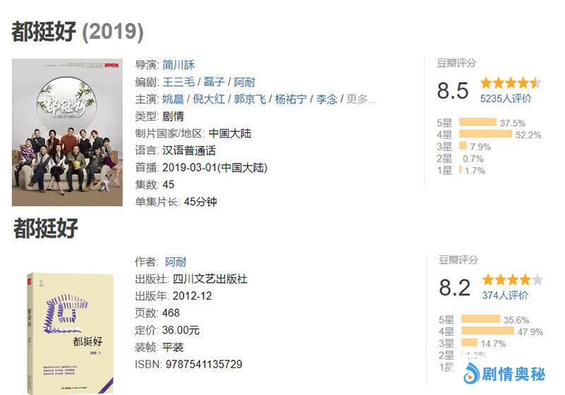 - 豆瓣给《都挺好》电视剧8.5分,原著8.2分,姚晨超许晴马丽