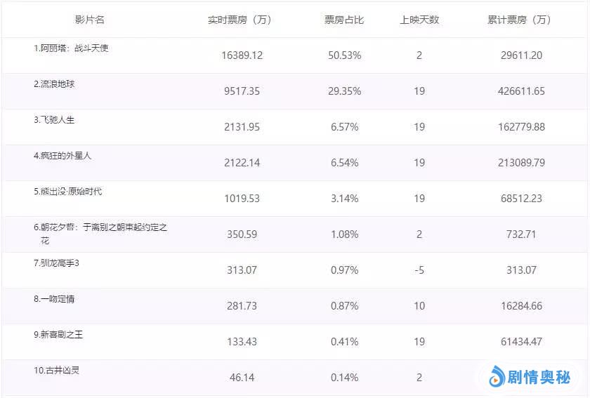 - 《阿丽塔:战斗天使》2天近3亿,《流浪地球》票房破42亿!