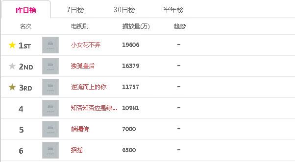 - 电视剧日播量:《独孤皇后》第二,《知否》完结10天后依然破亿