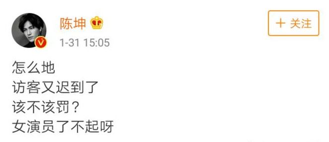 - 陈坤公开发文diss女演员迟到,竟是这个原因?网友:真爷们!