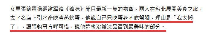 台媒报道说,女星张钧甯担任《锋味》节目的第一集嘉宾,两个人在台北展开了一场美食之旅,去吃清蒸螃蟹。谢霆锋说只吃螃身不吃蟹脚,理由是“我太懒了”!