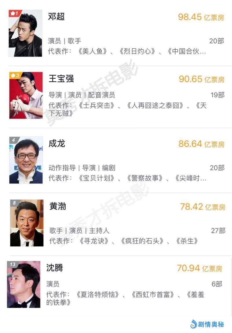 截至2019年1月中旬,内地个人历史票房排名中,邓超以98.45亿人民币,排在内地男演员的第一位,他之前的《分手大师》《恶棍天使》《从你的全世界路过》《乘风破浪》等作品,无论评价如何,全都无差别大卖。而排在女演员第一位的是白百何,个人累计票房为94.7亿,两部《捉妖记》是她的票房力作。随着今年春节档一大波国产大片的热映,下面五位明星个人累计票房将可能突破100亿,有趣的是,其中并不包括邓超,估计他都要哭了,因为邓超在个人票房榜首位置,已经待了两年了。