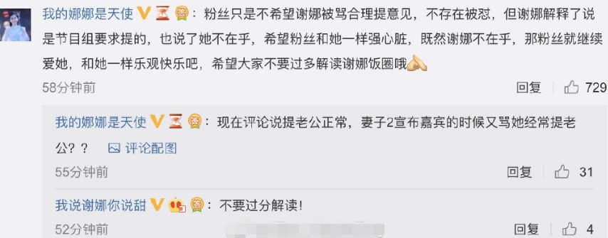 不过,谢娜超话粉丝大咖出面解释说:粉丝只是不希望谢娜被骂,合理提意见,不存在被怼,但谢娜解释说是节目组要求提的,也说了她不在乎,希望粉丝和她一样强心脏。