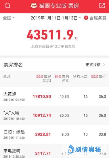 变形金刚衍生电影《大黄蜂》自1月4日在华上映以后,票房表现虽然不如《变形金刚》系列电影火爆,但凭借不错的口碑一直比较坚挺。由于上周末上映新片缺乏重磅商业大片,《大黄蜂》继续以30%左右的排片,牢牢占据优势,周末三天拿到1.78亿元票房,截至1月13日周日,累计票房达7.35亿,超过该片在北美本土1.08亿美元(折合人民币约7.29亿元)的票房。