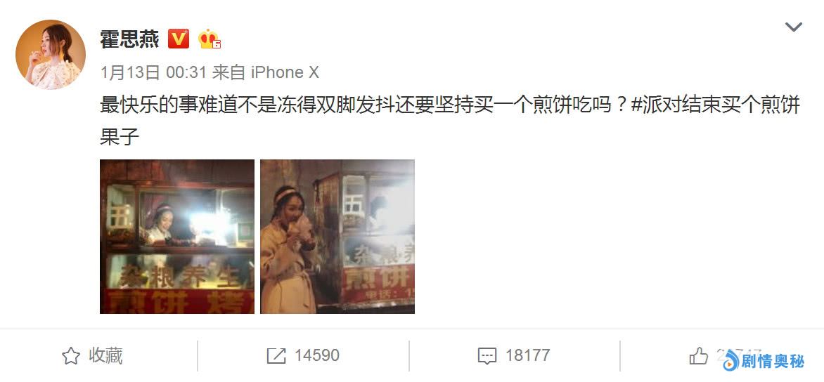 这一次的她又在深夜发文晒照分享出了自己“最快乐的事情难道不是冻得双脚发抖还要坚持买一个煎饼吃吗?派对结束买个煎饼果子”的小趣事。