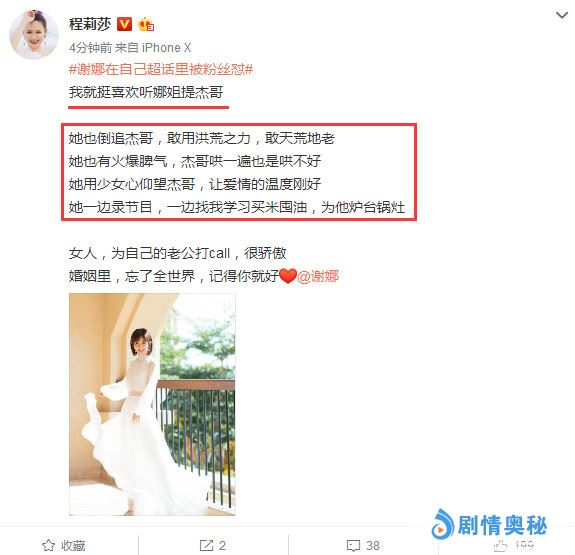 程莉莎发文力挺谢娜说:我就挺喜欢听娜姐提杰哥,她也倒追杰哥,敢用洪荒之力,敢天荒地老!她也有火爆脾气,杰哥哄一遍也是哄不好!女人,为自己的老公打call,很骄傲。婚姻里忘了全世界,记得你就好。