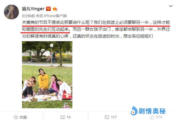 女演员颖儿也开口回应此事:夫妻类的节目不提彼此那要说什么呢?我们在旅途上必须要聊另一半,这样才能和棚里的先生们互动起来。而且一群女孩子出门,肯定都会聊到另一半,外界过分的解读有时候真的心疼,还真的怀念在旅途的时光,想念各位姐姐们 。