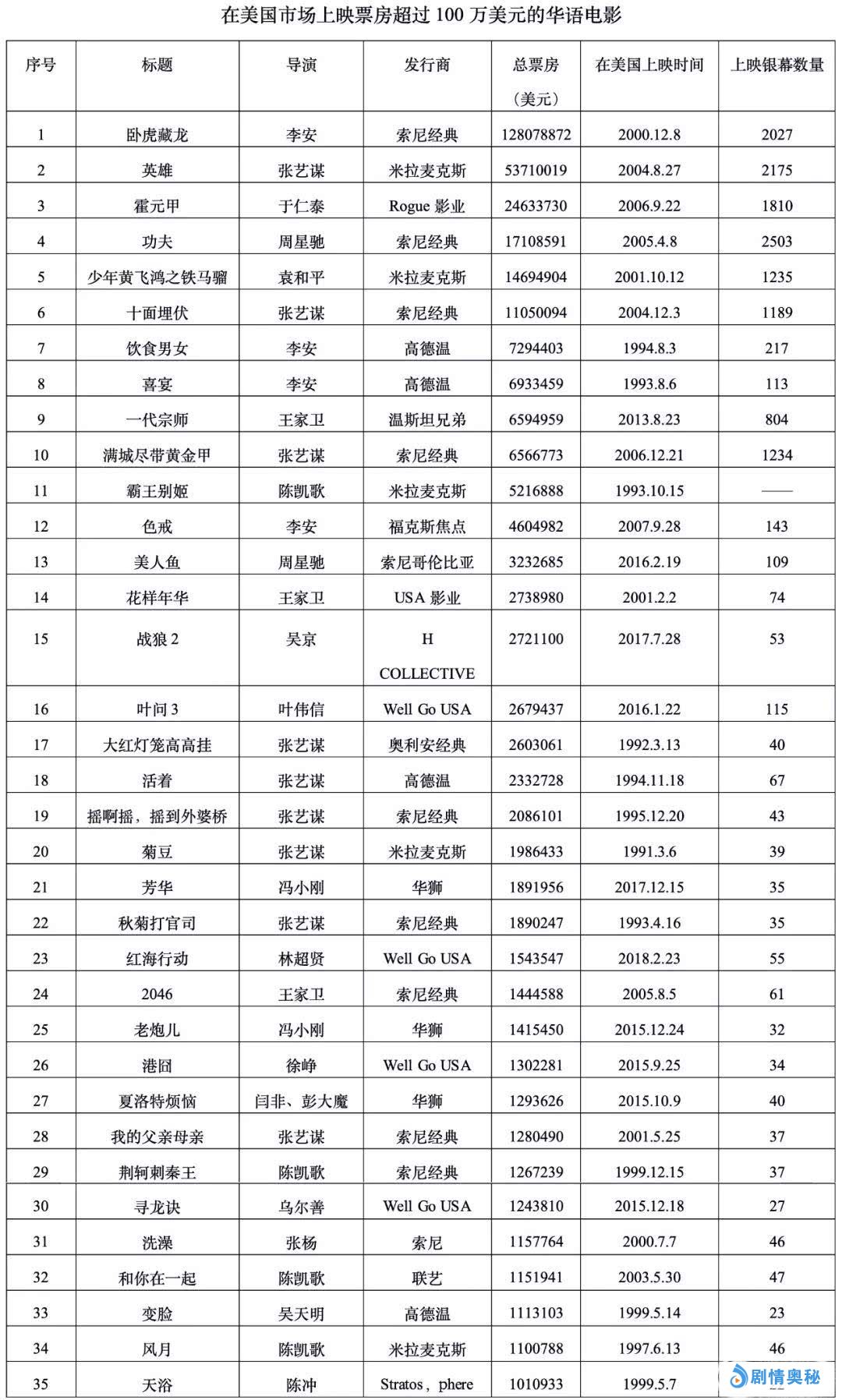 这35部作品,大致可分为三类,一类是武侠、功夫电影,在香港电影的长期影响下,对北美观众而言,来自中国的武侠功夫片形成了一定的品牌效应。因此在北美票房最成功的6部华语电影均属此列,第二类是张艺谋、李安、陈凯歌、王家卫、张杨、吴天明等导演的艺术成就较高的作品,其中张艺谋、李安和陈凯歌可谓是三位在北美最有票房号召力的中国导演,他们分别有9部、4部和4部电影在美国票房超过100万美元。这是因为他们都有强烈的艺术风格,曾获得重要的国际电影节奖项,在北美艺术电影观众群中累积了人气。第三类则是近年来在中国本土市场取得票房成功的热门影片,如《美人鱼》《战狼2》《叶问3》等,大多通过华狮和Well Go USA这两家公司在北美发行。