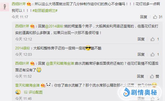而在这波福利中,网友们也再次尝到了肉痛的感觉。“所以这么大场面就出现了几分钟制作组你们的良心不会痛吗!花灯戏多一点啊我可以!”在欣赏日常花絮同时,大家发现明兰身后的布景华丽得不像话,就连路人手里的梅花灯,都精致得让人欢喜异常。更别说一眼望不到边的群演,以及周围的高脚大楼。实打实的存在,却又实打实地被剪掉。如此宏大的场面竟然只出现了几分钟,真是浪费!还有之前的曲水流觞,被一分为三的古船......粉丝们看在眼里,更是疼在心上。
