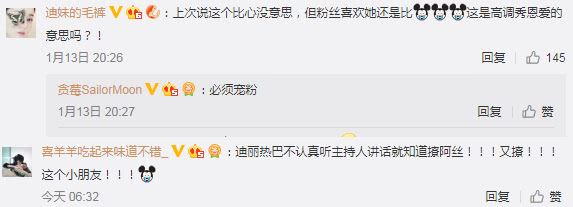 “这是高调地秀恩爱吗?迪丽热巴不认真听主持人讲话就知道撩阿丝,又撩!这个小朋友!!”自然,吃醋的小可爱们还是有的,因为毕竟爱豆是对着镜头外的阿丝们比心的,不是她们!所以必须得骄傲地吃味,顺便吐槽一下。不走心工作就算了,还当着其他粉丝面开撩。后宫这么大,是不是要雨露均沾呢?