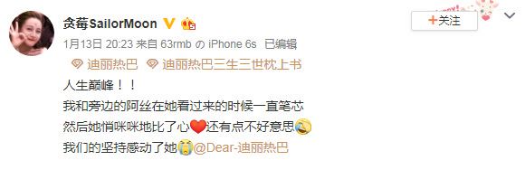 被偷偷比心的几位小伙伴们,喜悦之情更是以言表。所以大家才会听到那一抹激动的尖叫声。故意压低了嗓门,但其中的兴奋和感动,却没办法压下去。老话真的说得没错,坚持就是胜利。阿丝们的坚持,幸好换来了甜甜的回报。恭喜啦~要知道,对于比心这种带点撒娇意味的宠粉行为,我们的热巴同学是不太去主动尝试的,但毕竟是自己的“女人”,怎么着也得宠着啊!所以尽管某人不喜欢卖萌比心,但为了一大堆嗷嗷待哺的爱丽丝们。小小的牺牲,还是能贡献的!