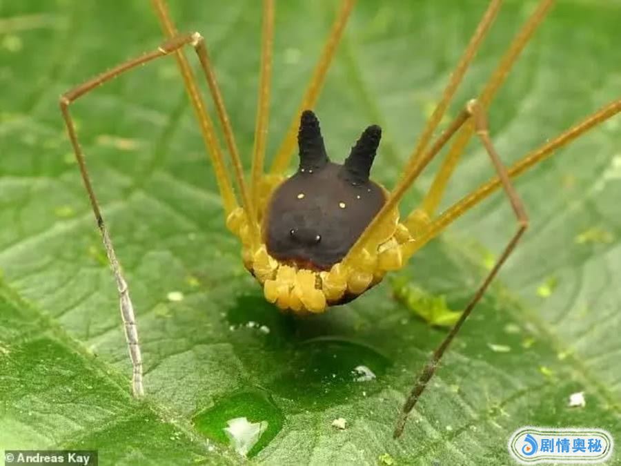 我们从照片中可以看到,这位摄影师在安德烈亚斯·凯在厄瓜多尔热带雨林中拍摄的,之间这只蜘蛛长着8条细长的黄色的腿,但是仔细再看它的头,竟然像一个黑色的狗头,上面还有一对黄色的“眼睛”,看上去非常可爱。