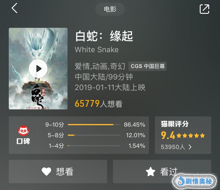 1月11日,由黄家康、赵霁执导,追光动画和华纳兄弟制作的原创动画电影《白蛇:缘起》正式上映,上映四日,其猫眼评分由9.2分上涨至9.4,被许多观众认为是“国漫中难得一遇的经典”。