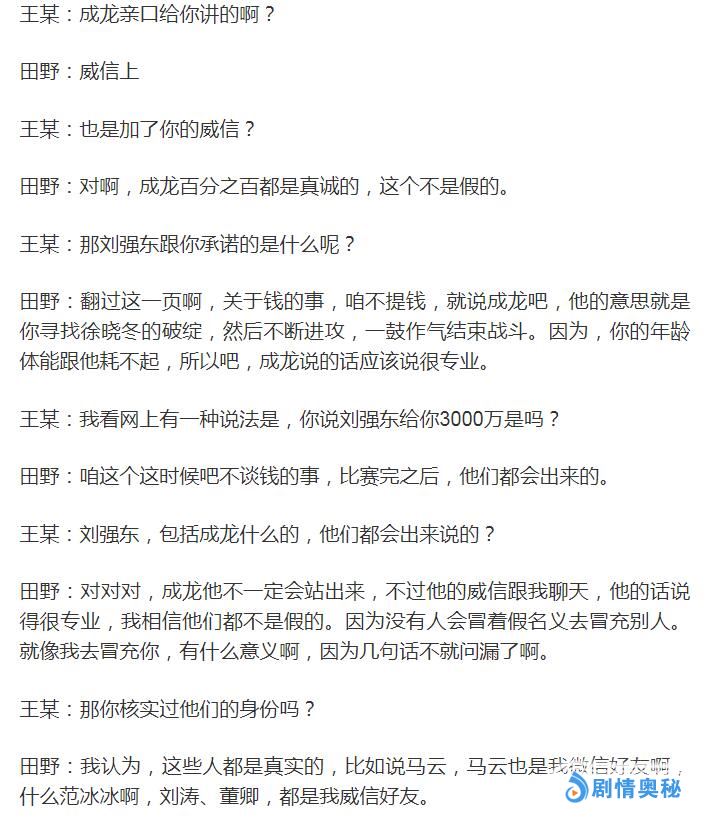 王某:成龙亲口给你讲的啊?田野:对啊,成龙百分之百都是真诚的,这个不是假的。王某:那刘强东跟你承诺的是什么呢?田野:翻过这一页啊,关于钱的事,咱不提钱,就说成龙吧,他的意思就是你寻找徐晓冬的破绽,然后不断进攻,一鼓作气结束战斗。因为,你的年龄体能跟他耗不起,所以吧,成龙说的话应该说很专业。