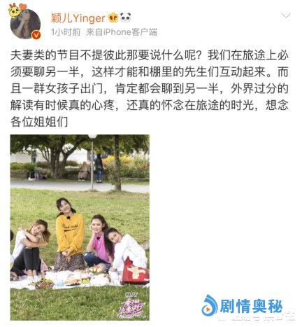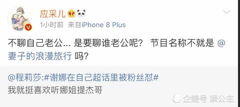 谢娜还没有在微博说什么,《妻子的浪漫旅行》的其他三个人就在微博上开始为谢娜路见不平了!颖儿称“我们在旅途中是必须要聊到另一半的!不聊这个聊什么呢”