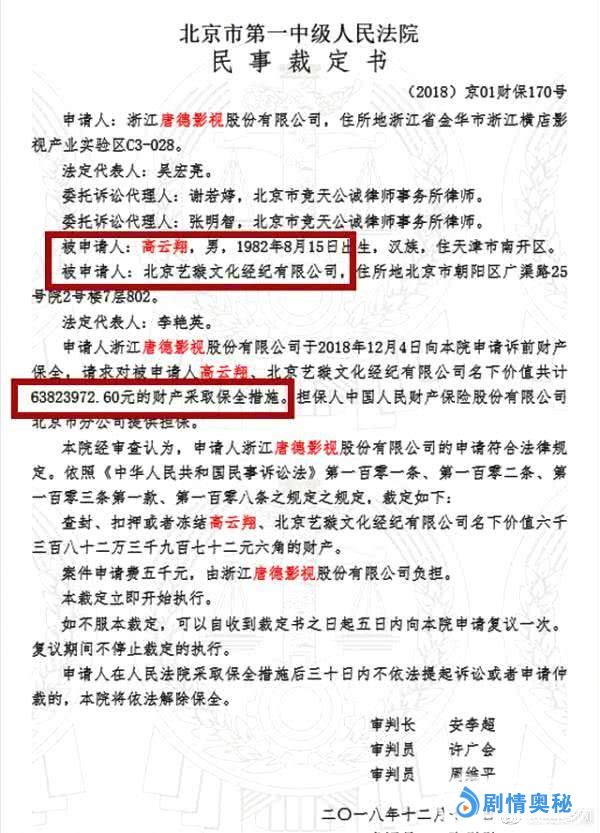 1月4日,中国裁判文书网发布裁定书显示,唐德影视于2018年12月4日向法院请求对高云翔、北京艺璇名下价值共计6382.4万元的财产采取保全措施。经北京市第一中级人民法院审查,裁定查封、扣押或者冻结高云翔、北京艺璇名下价值6382.4万元的财产。