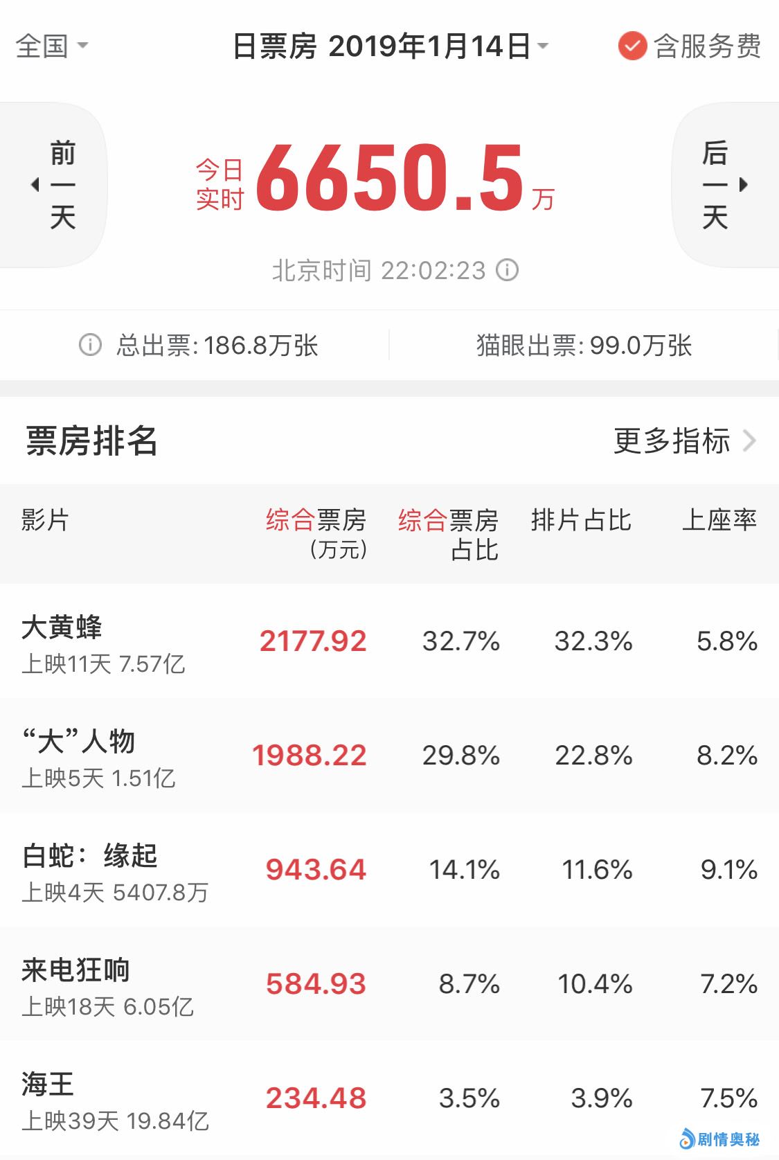 从票房成绩上来看,好莱坞大片《大黄蜂》的票房成绩一路领先,从上映之后就一直牢牢占据单日票房冠军的宝座,上映11天总票房突破7.5亿。另一部国产新片《“大”人物》的票房成绩不错,上映5天总票房突破1.4亿,霸占单日票房榜的第二位。
