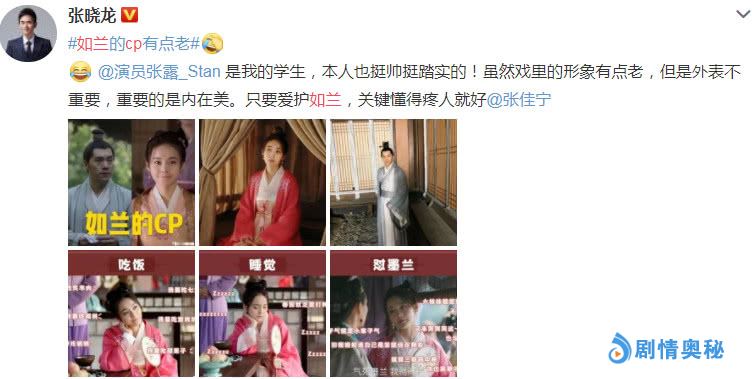 张晓龙是如兰饰演者张佳宁的亲舅舅,看见张露被吐槽后立马发文回应道:“本人也挺帅挺踏实的!虽然戏里的形象有点老,但是外表不重要,重要内在美,只要爱护如兰,关键懂得疼人就好”,何炅也发文力挺说觉得不老啊!看来张露在娱乐圈中的人缘还是非常不错的嘛!也希望他与张佳宁在后面的剧情中能甜一点。