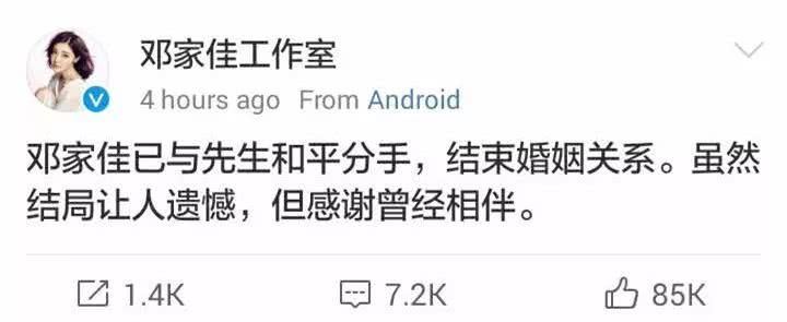 今天,邓家佳通过工作室宣布离婚:邓家佳已与先生和平分手,结束婚姻关。虽然结局让人遗憾,但感谢曾经陪伴。