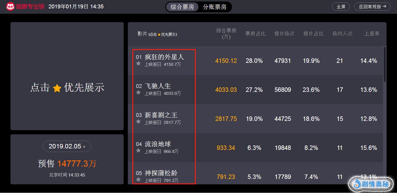 排在第一的是由宁浩执导,沈腾、黄渤等人主演的喜剧科幻片《疯狂的外星人》,该片以预售累计总票房4150万位居第一,接着是由韩寒执导,沈腾主演的喜剧片《飞驰人生》,以4033万位居第二,而作为周星驰回归荧幕力作《新喜剧之王》一度遭遇碾压,以2817.7万屈居第三,吴京的《流浪地球》以966.8万排在了第四,成龙的《神探蒲松龄》以791,2位居第五。(以上数据截止发文时间)