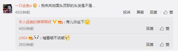 不过如果当有人提出她头顶上的那块时,可能会再接收到成堆的白眼也说不定。“我岚岚侧面头顶那的头发是不是......嘘,看破不说破!”一些小可爱悄悄地暴露,在爱豆随意扎着的一个丸子(从手法上看一定是某人自己不用心绑的)旁出现了一片空白区,也就是大家不敢说出口的秃。虽然很想无视它,但奈何存在感太强,没办法转移注意力。又不能明说。秉承着看破不说破的惯例,大家只能在墙角默默地偷笑,绝对不告诉正主了。因为秦爱豆是要面子的!