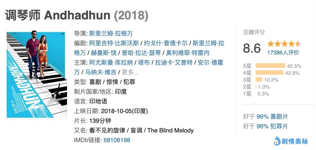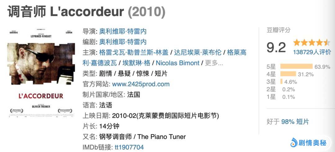 和常规印度片相比,这部电影还有很值得期待的一点,它改编自2010年的法国短片《调音师》。这也是一部豆瓣神作,近14万人评价,评分高达9.2。
