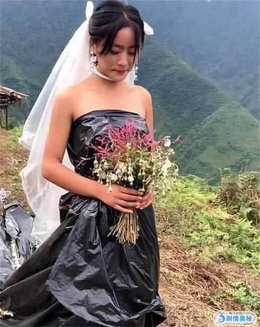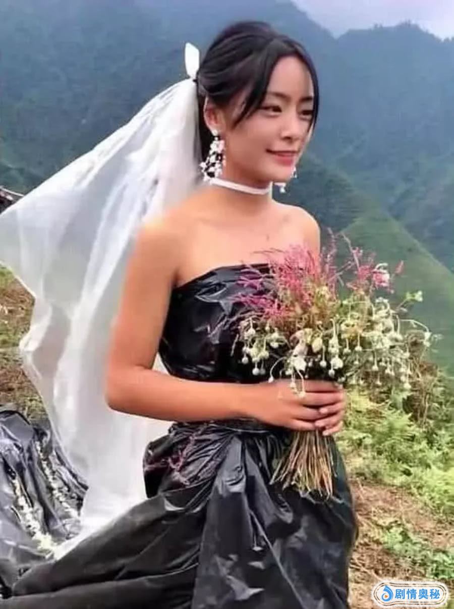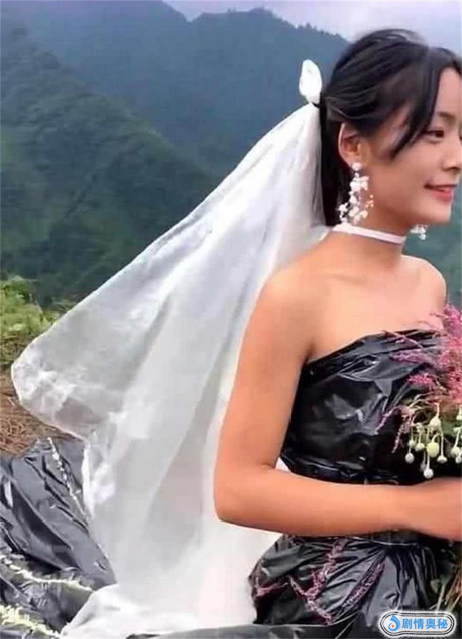 原来这个女孩穿的是用黑色的塑料袋做出的婚纱,而且头上的头纱则是戴着用白色塑料袋做出的,虽然看上去很简朴,但是却很好看,不得不不说这位新娘一定是一位能吃苦的女生。也能看出这个女孩子并没有要求的那么的高,长得这么漂亮,新郎可以说大赚啊。