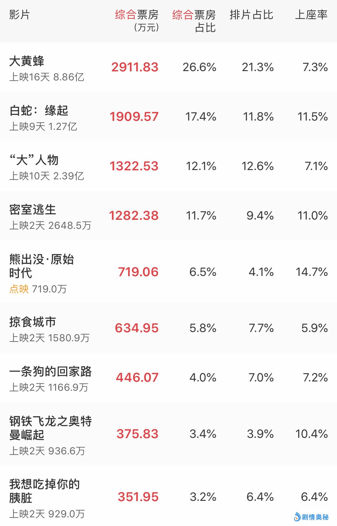 从票房数据来看,排在第一位的依然是好莱坞大片《大黄蜂》,排在第二位的是国产动画片《白蛇:缘起》,排在第三位的则是国产片《“大”人物》,从单日票房榜单的前三名来看,依然是三部已经上映有一段时间的电影,可见本周上映的几部新片,都不同程度上的票房扑街了。