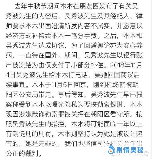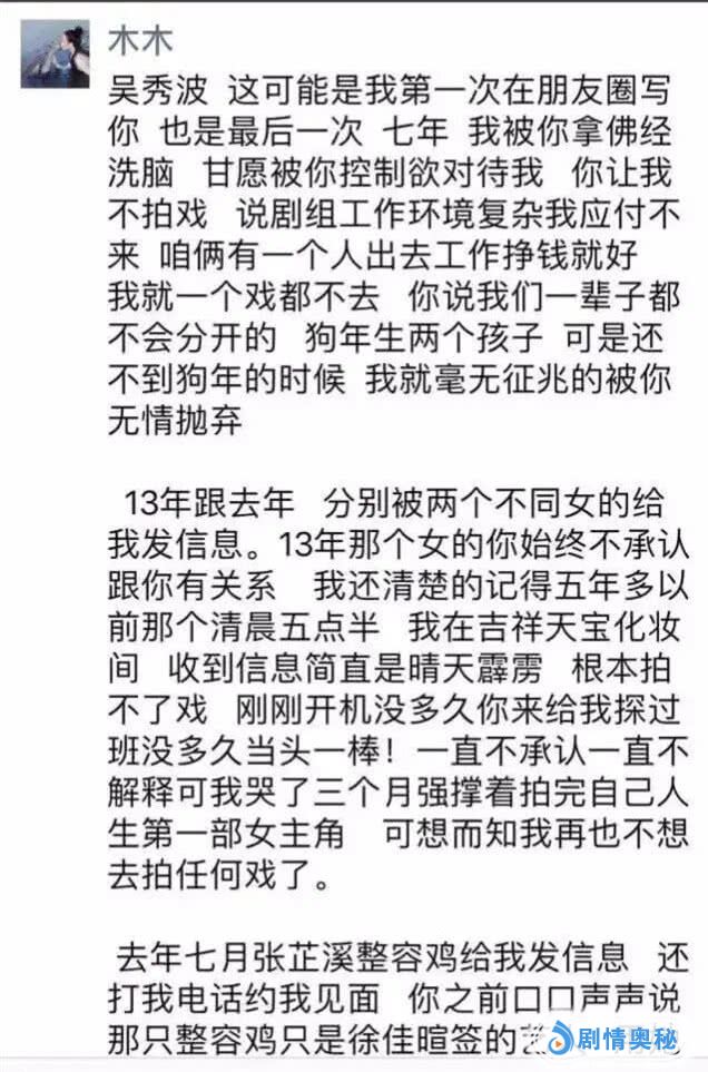 当时,十八线女明星陈昱霖发朋友圈,爆出自己和吴秀波的7年地下情,也爆出吴秀波还和其他女演员有染,称自己已经患上抑郁症了,还称吴秀波用佛经给自己洗脑。