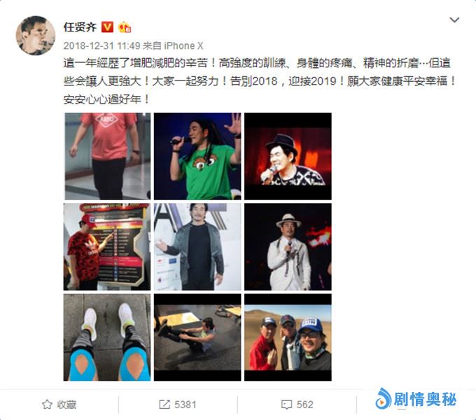 任贤齐自出道以来一直以敬业著称,此前为了新戏角色需要,不顾形象增肥到200斤,今年又用两个月的时间迅速变回以往体重,“说瘦就瘦”的速度惊呆网友。任贤齐年末也在微博上表示“这一年经历了增肥减肥的辛苦!高强度的训练、身体的疼痛、精神的折磨⋯但这些会让人更强大!”,让大家看到了他惊人的意志力和敬业精神。