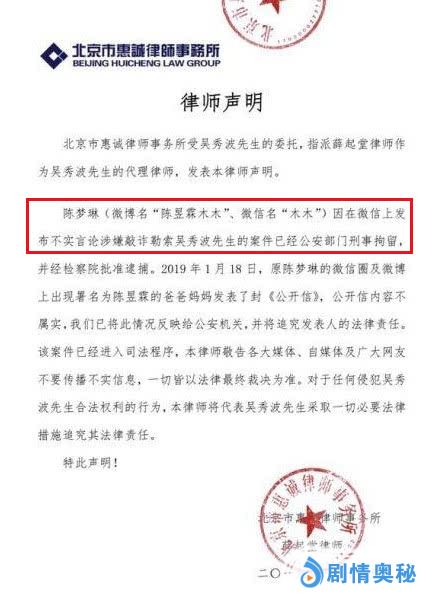 针对陈昱霖父母的公开信,吴秀波方发律师声明予以否认,称“公开信内容不属实”,“已将情况反映给公安机关,并将追究发表人的法律责任”。而1月19日傍晚,陈昱霖父母再度发声明,坚称“《公开信》所说的内容全部都是客观事实”。目前,双方各执一词,真相扑朔迷离。
