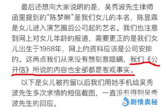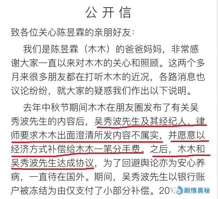 其实,无论陈昱霖父母的公开信是否属实,但信中透露的一处关键信息值得关注:“吴秀波先生及其经纪人、律师要求木木出面澄清所发内容不属实,并愿意以经济方式补偿给木木一笔分手费。之后,木木和吴秀波先生达成协议”。
