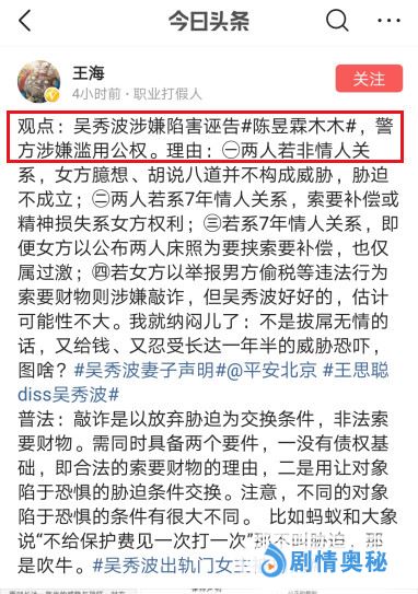 鉴于此事已在全国引起广泛社会影响,目前已有职业打假人王海在网上公开发表观点称“吴秀波涉嫌陷害诬告陈昱霖,警方涉嫌滥用公权”,并@平安北京 。我们希望警方能够尽快向公众披露陈昱霖涉嫌敲诈勒索一案目前可公开的相关细节,以正视听。