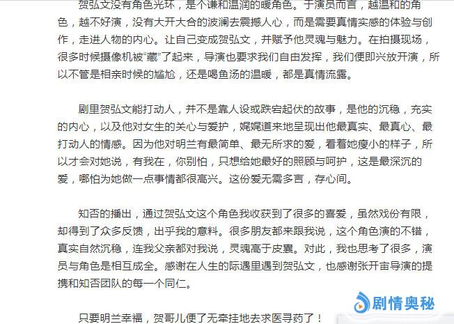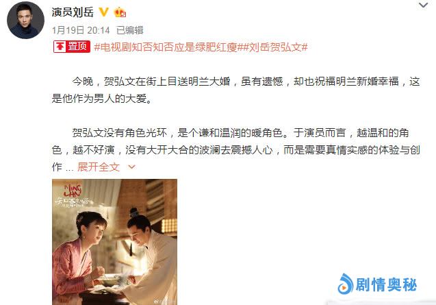 在明兰出嫁当晚,饰演贺弘文的演员刘岳在微博上发长文表达了自己对于明兰的祝福:“今晚,贺弘文在街上目送明兰大婚,虽有遗憾,却也祝福明兰新婚幸福,这是他作为男人的大爱。”就像刘岳本人的发文一样,虽然明兰最终没有嫁给贺弘文,但是作为深爱着并且心疼她的男人,依然是非常希望她得到属于自己的幸福。