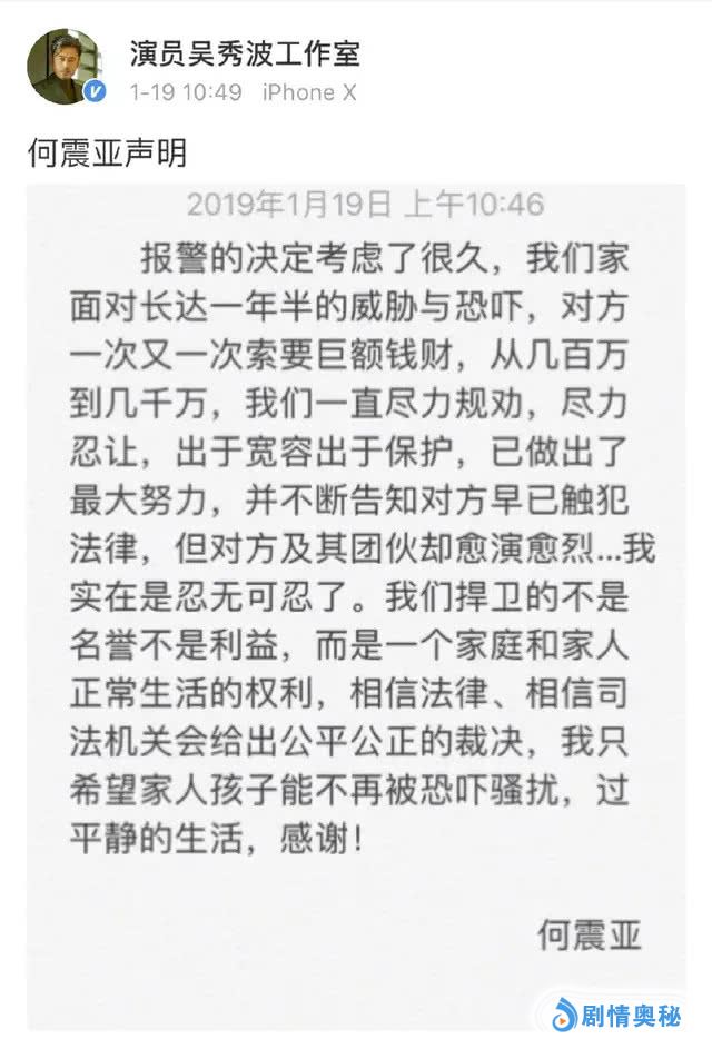 陈昱霖与吴秀波产生感情裂缝后,吴秀波的妻子何震亚也是知道了吴秀波有了七年“小三”的这件事。所以为了平息,吴秀波与何震亚是共同商量要给陈昱霖一些钱的。但是陈昱霖却要了一次又一次,而且一次还比一次要得多。而除了敲诈钱财之外还与同伙对他们的老人和小孩等家人进行恐吓、威胁、骚扰。