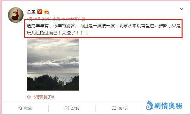 而且随着王思聪在一旁煽风点火,2019年娱乐圈这一把大火那是越烧越旺,就来知名脱口秀主持人金星更是安耐不住,也于事件发生的当天晚连续发布三条微博公开怒斥吴秀波,骂其为“渣男”。不仅得到了网友的一致好评和转发该言论,更是一度将事件再度推向了深渊。