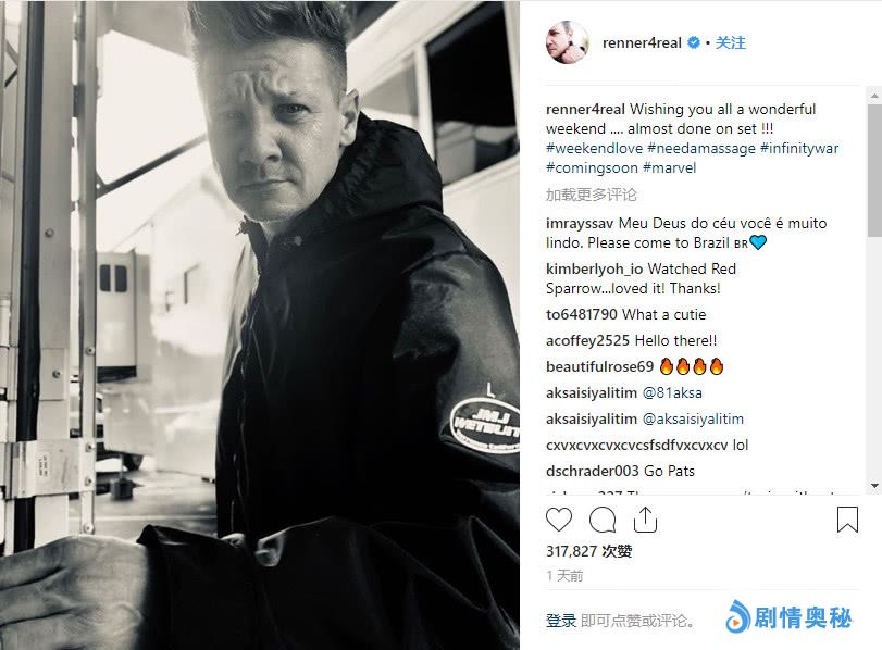 在他的Instagram账号上,雷纳分享了一张照片祝大家周末愉快!并补充说他的补拍工作差不多完成了。大家看看下面的照片: