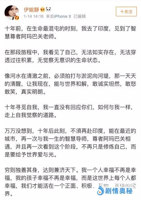 ——1月14日,伊能静发微博安利印度心灵导师的“心灵课程”,还晒出了报名方式和听课时间。多位网友提醒涉嫌传销且合法性存疑后,伊能静删除微博。而在这则微博中,伊能静对此“灵修”推崇备至。网友呼喊。