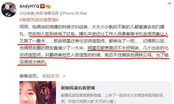 ——1月16日,“娱乐圈定时炸弹”黄毅清发文称谢娜张杰夫妇是铁公鸡,为了钱没底线。还惊爆两人当年结婚时,把熟悉的和不熟悉的都请去参加婚礼,别人都给完红包之后,中途又让工作人员拿着POS机刷红包,连化妆师造型师都未能幸免。因为这件事情两人少了一半的朋友。爆料之后,黄毅清还在评论区神补刀。(很多人惊掉眼镜,也有人说黄毅清蹭热度乱弹琴。)